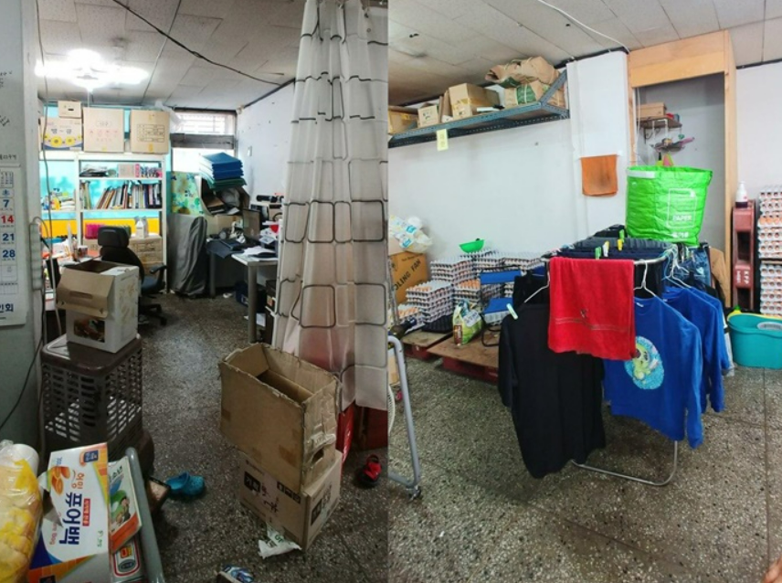 <가게 한켠에서 주거 생활을 하여 옷가지, 건조대 등 생활 용품이 섞여 있는 모습>