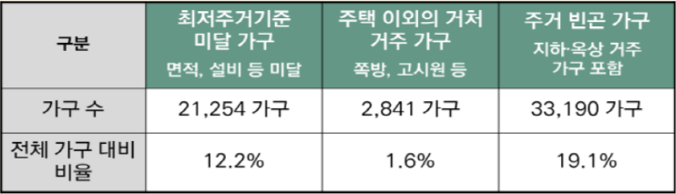 2021년 기준, 기초생활수급가구는 11,964 가구가 성북구에 거주하는데 공공임대주택은 11,124호로 기초생활수급가구 수보다 840 가구나 부족합니다. 최저주거기준 미달가구와 주거빈곤율 모두 서울시 평균보다 높은 상황이며 재개발 등 정비사업구역 71곳으로 노후저렴주택 철거로 인해 저소득 및 빈곤가구 거처가 상실될 우려가 매우 큽니다. *참고. 최저주거기준 미달가구 및 주거빈곤가구 실태분석, 한국도시연구소(이원욱 의원실)(2017)